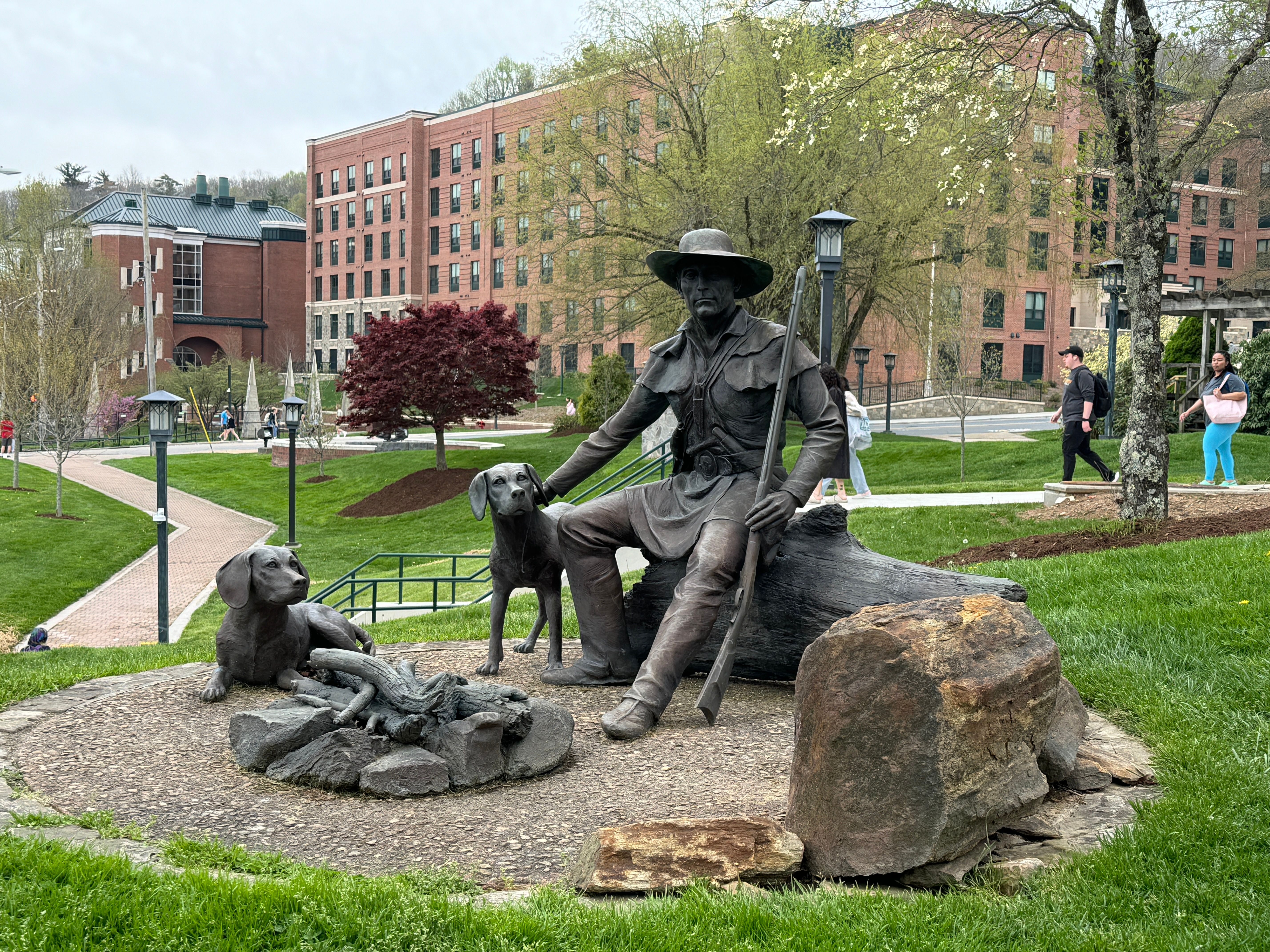 Sculpture of Daniel Boone and his hunting dogs on the grounds of App State U. Photo by Debbie Stone